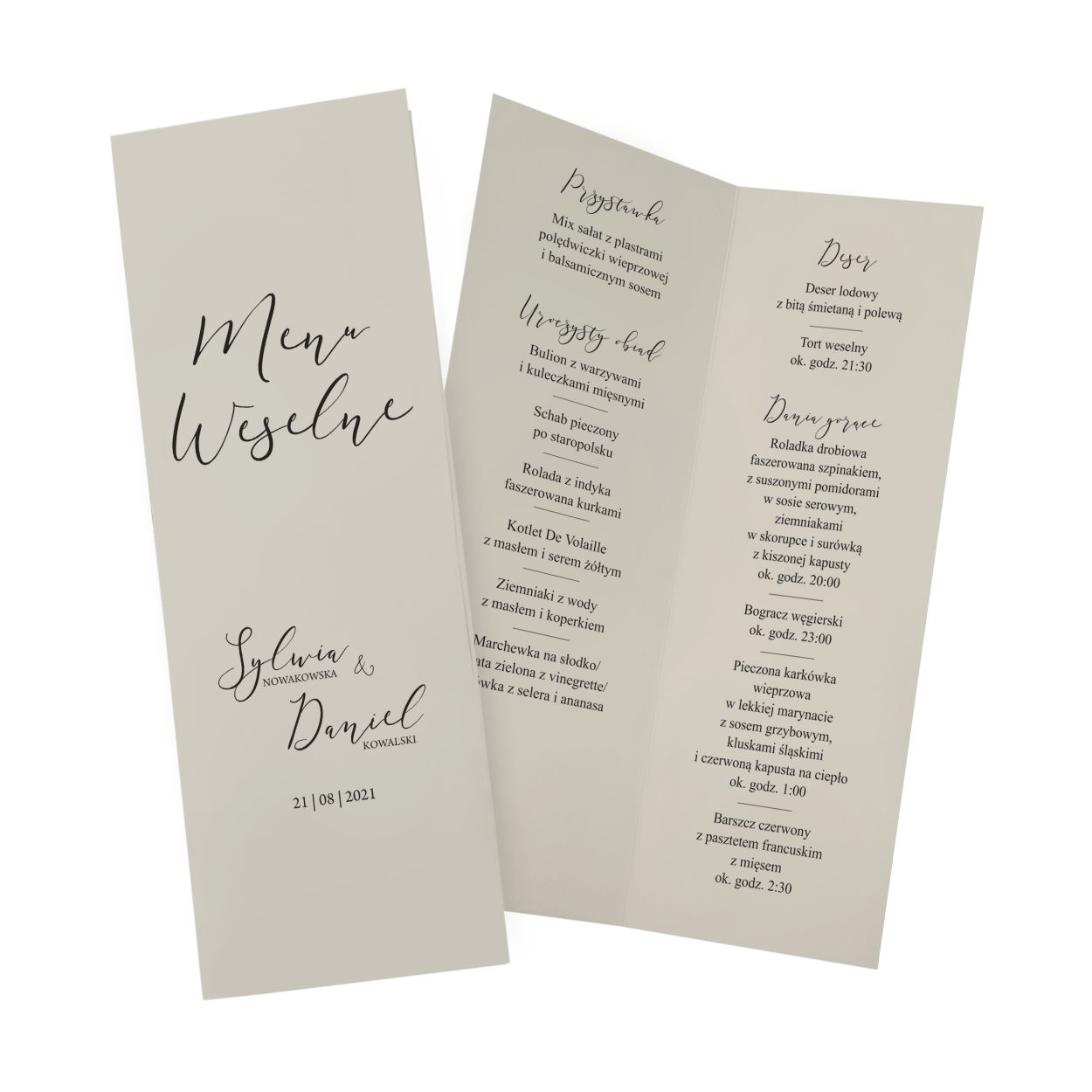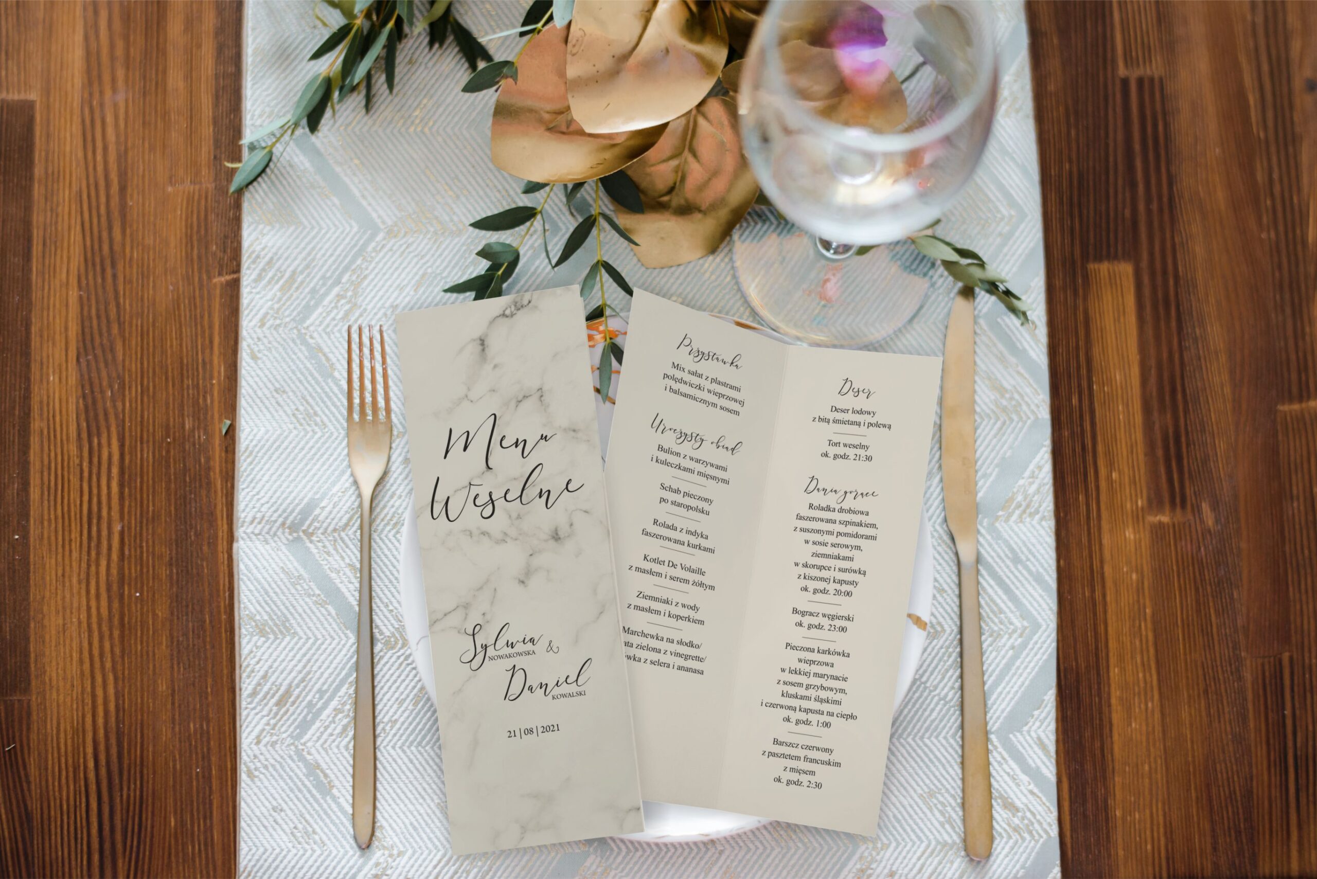 - personalizację według przesłanej listy imion nowożeńców, daty ślubu oraz serwowanych dań