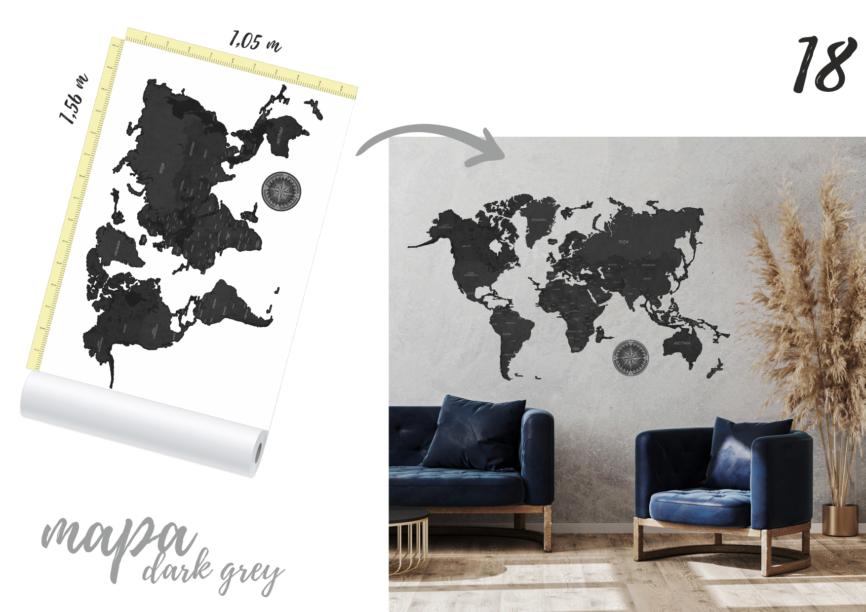 Naklejki drukowane są na wysokiej jakości specjalnej folii matowej, która doskonale nadaje się do pokoju jak i innych pomieszczeń. Dodatkowo na wydruk z wierzchu naklejona jest przeźroczysta folia transferowa ułatwiająca naklejenie mapy. Po naklejeniu mapy folia transferowa powinna być delikatnie usunięta.
