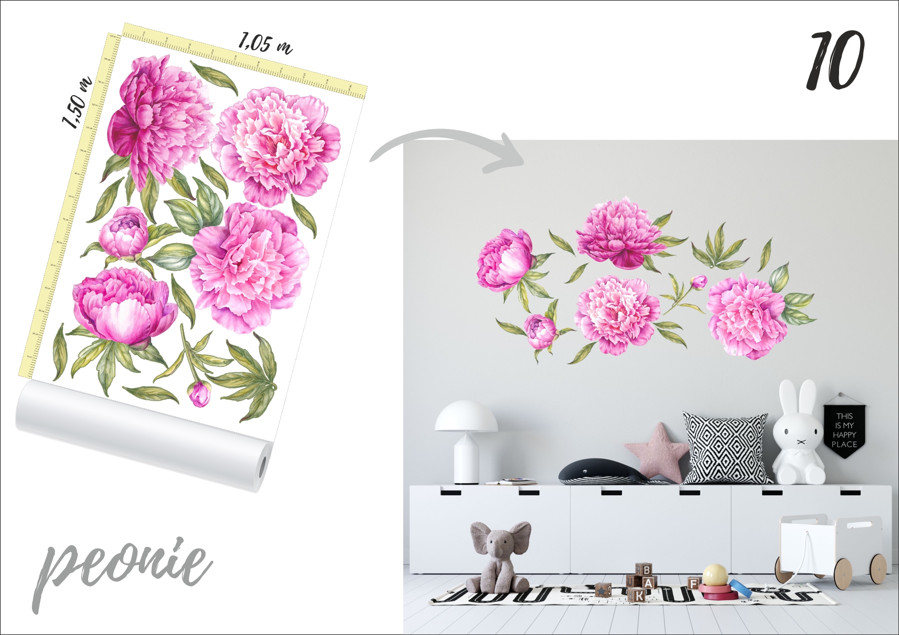 Wymiary poszczególnych elementów można sprawdzić na umieszczonej miarce. Rozłożenie na ścianie jest dowolne.