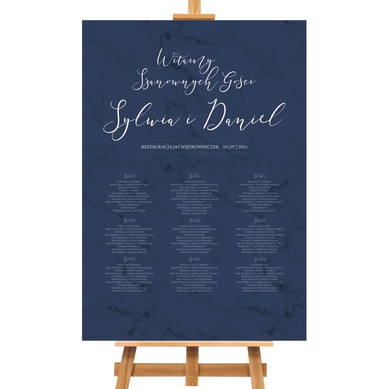 Eleganckie, kolorowe plansze z listą gości. Na planszy znajduje się rozpiska gości wraz z przypisanymi stolikami. Plansza z listą gości może być ustawiona przy wejściu, ułatwiając jednocześnie gościom odnalezienie swojego miejsca na sali. Plansze drukowane są na grubym, śliskim materiale, który jest odporny na wilgoć i uszkodzenia mechaniczne. Może być śmiało wykorzystany na zewnątrz, podczas wesela w plenerze, nawet nagłe załamanie pogody nie jest mu straszne. Druk jest ekologiczny, bardzo wysokiej jakości.