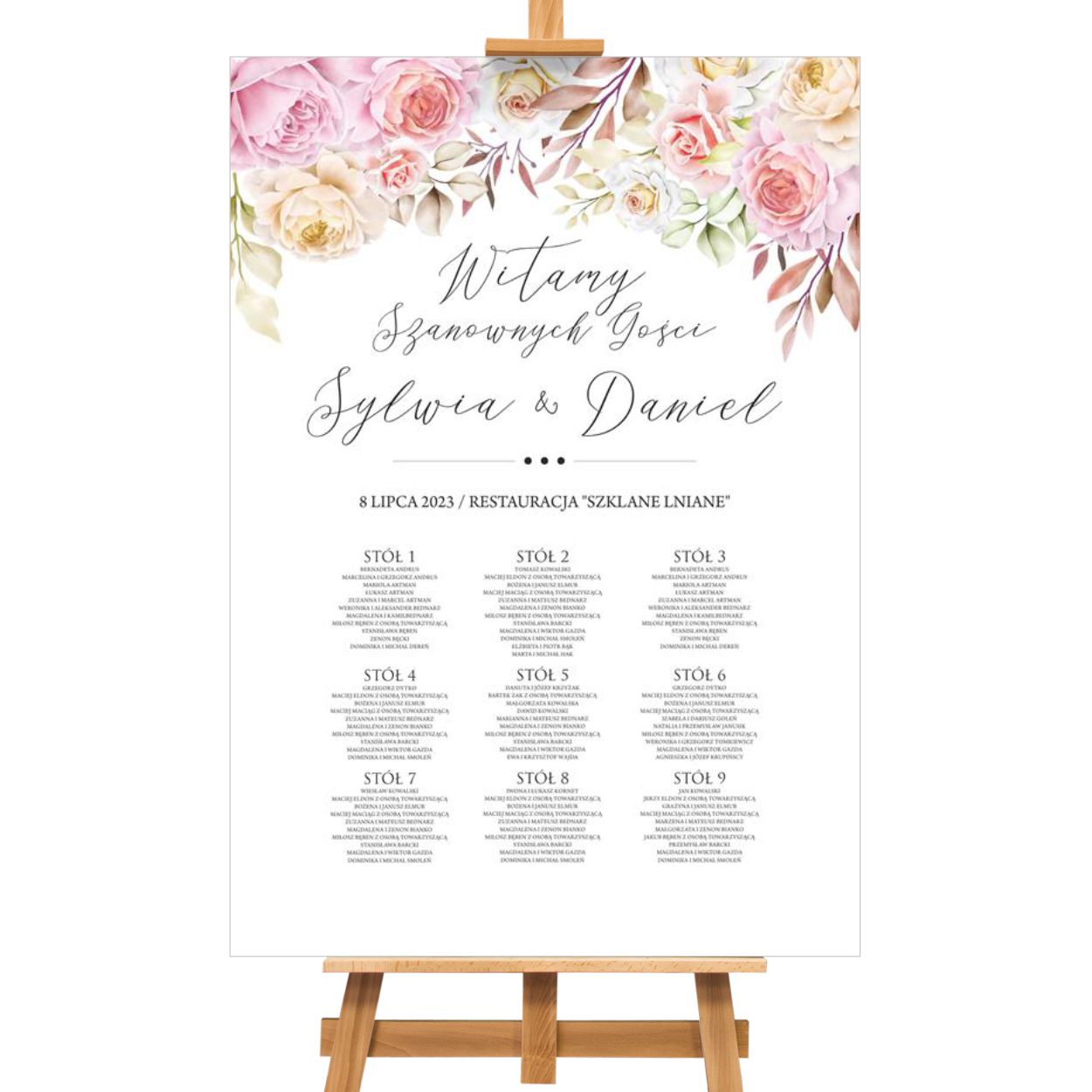 Eleganckie, kolorowe plansze z listą gości. Na planszy znajduje się rozpiska gości wraz z przypisanymi stolikami. Plansza z listą gości może być ustawiona przy wejściu, ułatwiając jednocześnie gościom odnalezienie swojego miejsca na sali. Plansze drukowane są na grubym, śliskim materiale, który jest odporny na wilgoć i uszkodzenia mechaniczne. Może być śmiało wykorzystany na zewnątrz, podczas wesela w plenerze, nawet nagłe załamanie pogody nie jest mu straszne. Druk jest ekologiczny, bardzo wysokiej jakości.