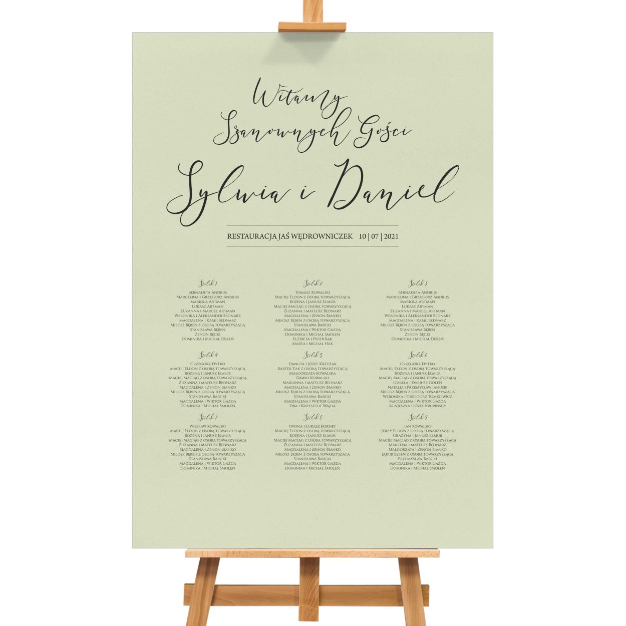 Plansza z listą gości może być ustawiona przy wejściu, ułatwiając jednocześnie gościom odnalezienie swojego miejsca na sali. Drukowana jest ona na grubym, śliskim, matowym materiale, który jest odporny na wilgoć i uszkodzenia mechaniczne. Może być śmiało wykorzystany na zewnątrz, podczas wesela w plenerze, nawet nagłe załamanie pogody nie jest mu straszne. Druk jest ekologiczny, bardzo wysokiej jakości.