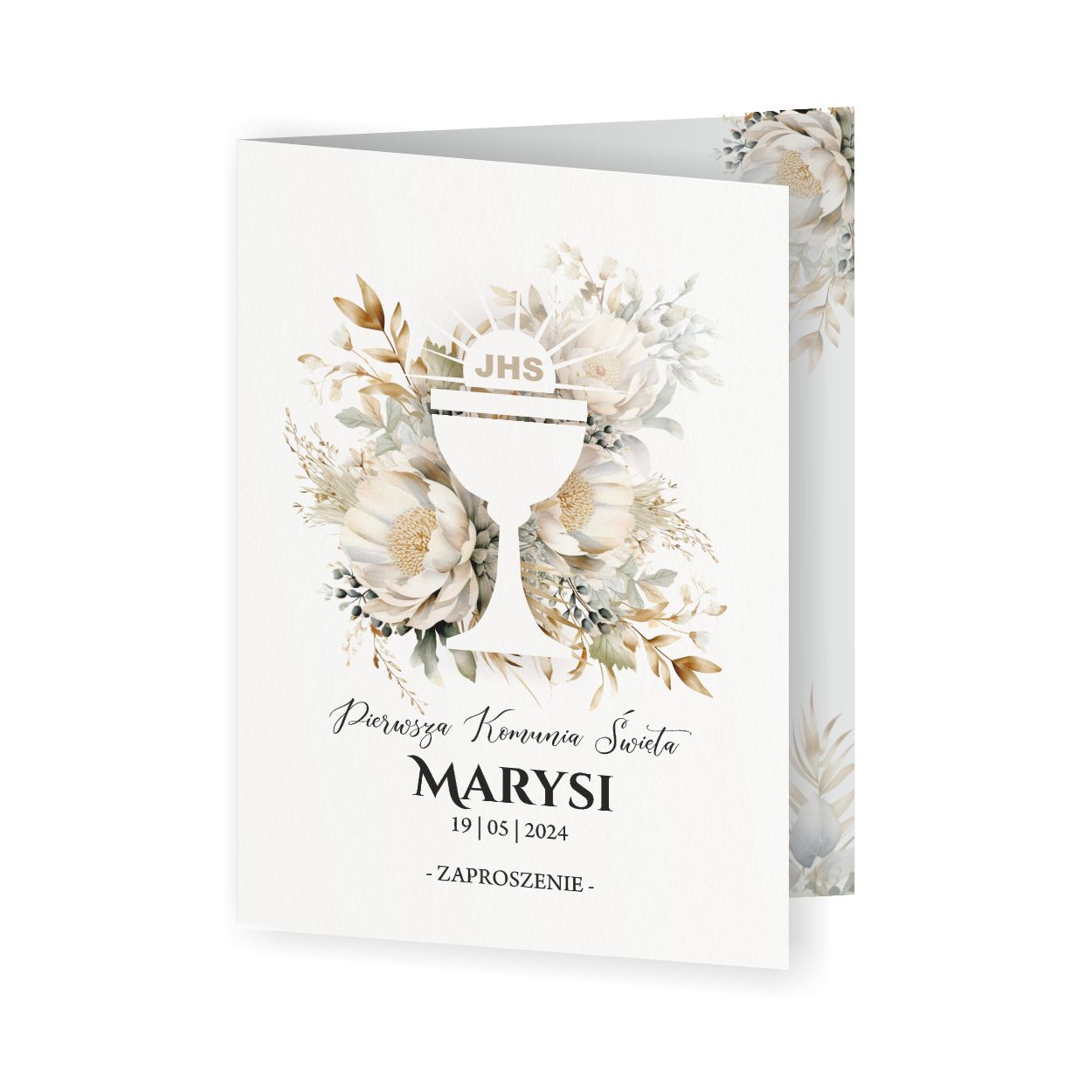 Eleganckie zaproszenie – składane, w formacie A5 (po złożeniu A6, ok. 148×105 mm), idealnie dopasowane do uroczystego charakteru wydarzenia.