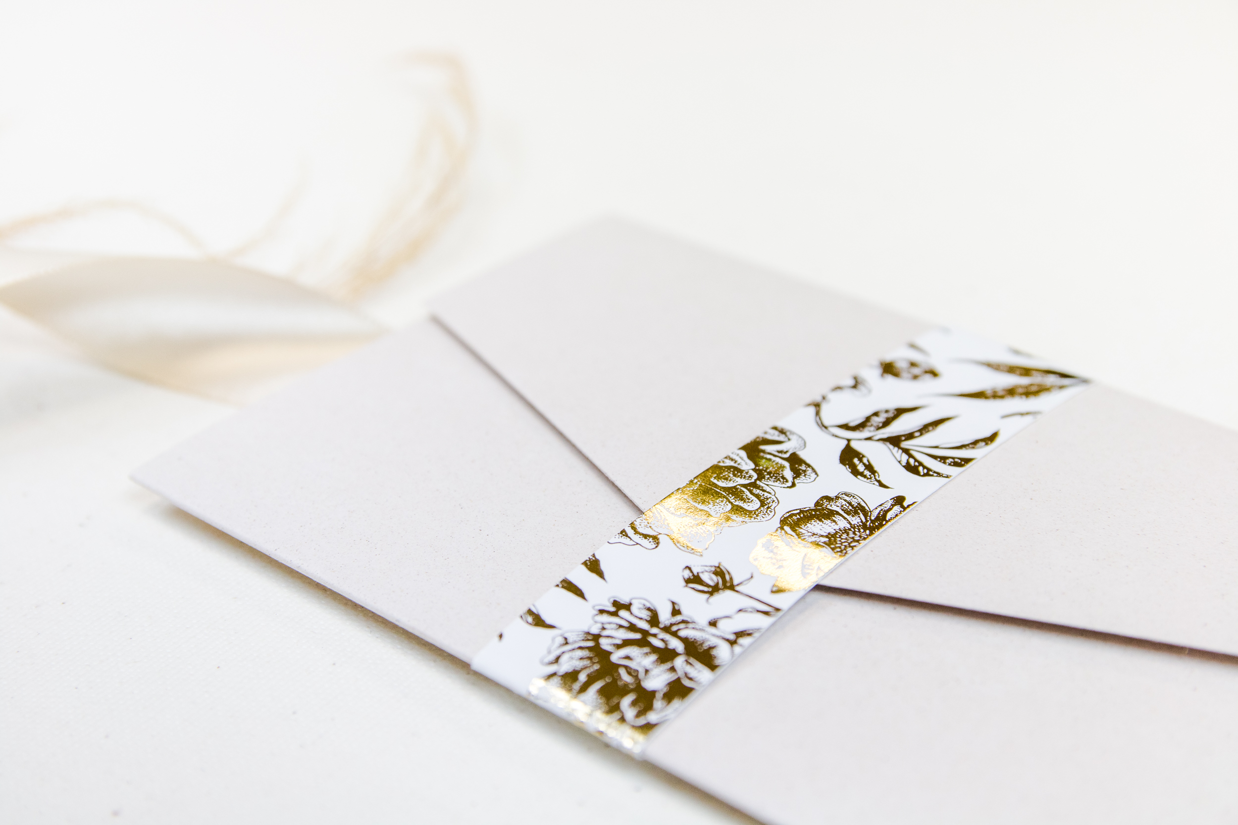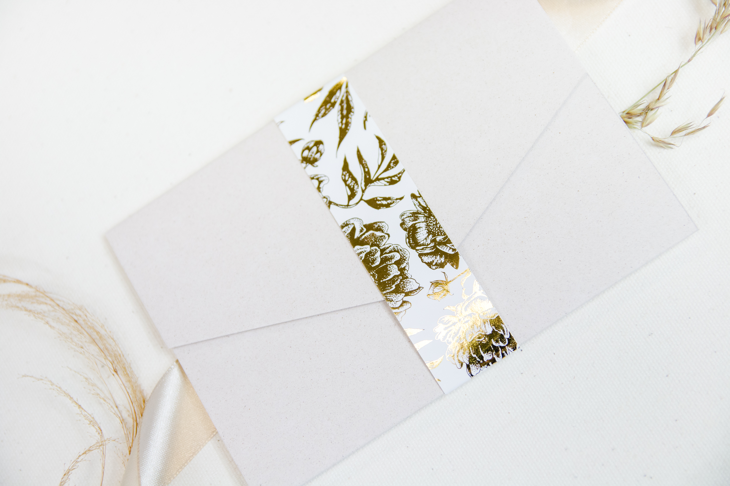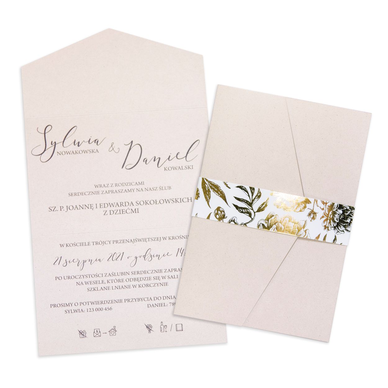 Kopertowa okładka w zaproszeniach wykonana jest z wysokiej jakości oryginalnego papieru o dużej gramaturze, bigowanego w dwóch miejscach w celu estetycznego i wygodnego składania. Całość zwieńczona jest obwolutą bądź sznurkiem. Po otwarciu ukazuje nam się treść zaproszeń.