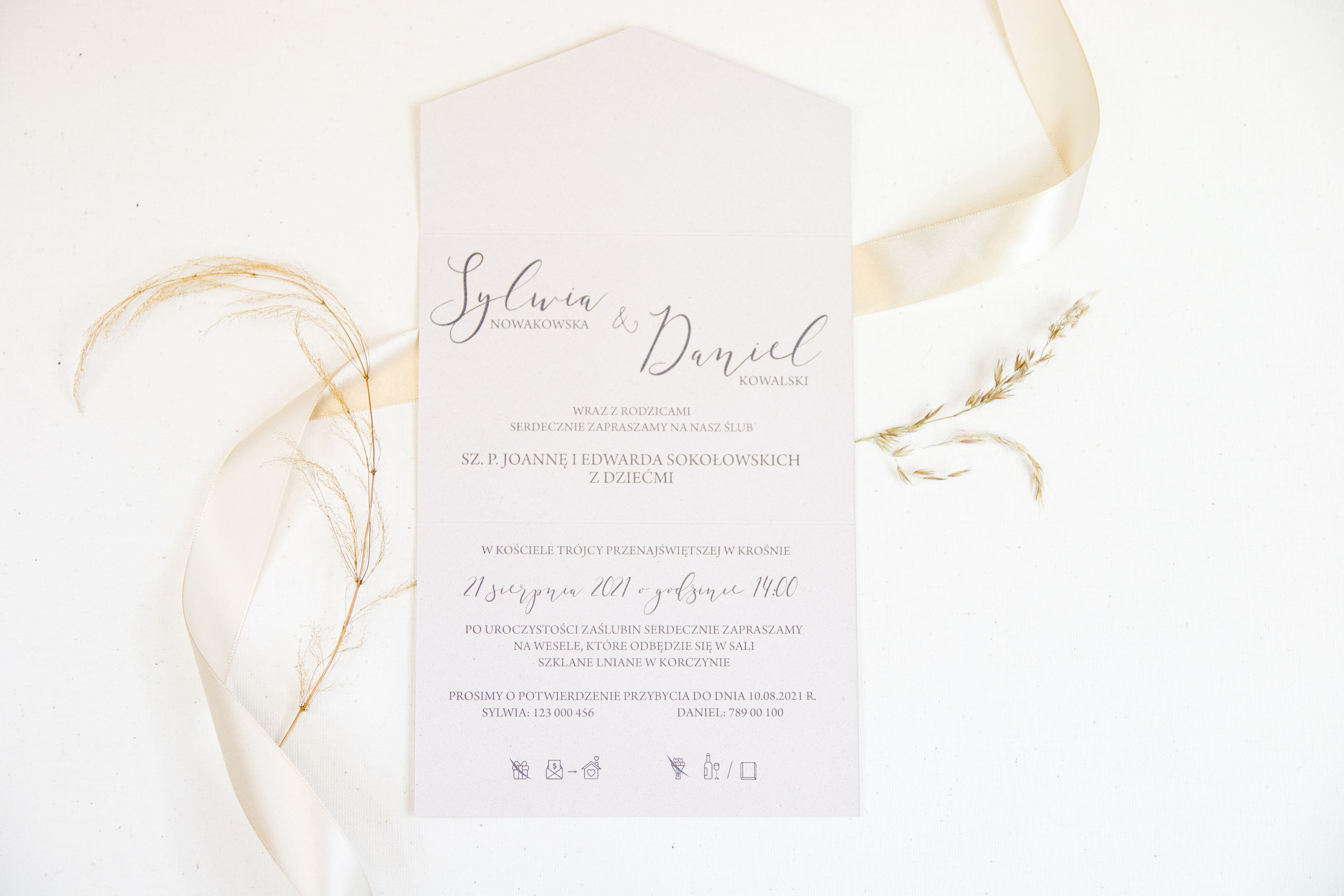 - zaproszenie rozłożone o wymiarach 29×15 cm po złożeniu o formacie 10×15 cm z wysokiej jakości papieru o dużej gramaturze